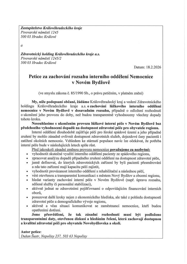 Jak podpořit písemnou petici pro zachování rozsahu interního oddělení Nemonice v Novém Bydžově, která bude předána Zastupitelstvu Královéhradkeckého kraje a Zdravotnickému holdingu KHK a.s. k projednání?