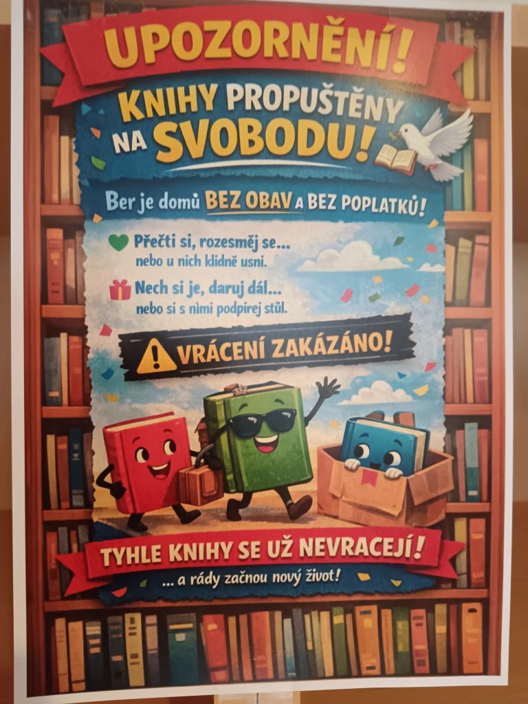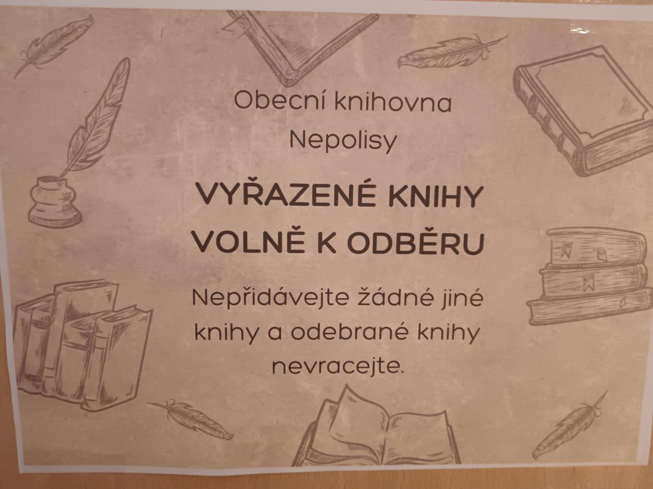 Obecní knihovna nabízí k volném odběru vyřazené knihy ze svého knihovního fondu. Knihy lze odebírat v přízemí Obecního domu z regálu. Nenoste prosím knihy zpět a ani nám do regálu nedávejte žádné vlastní vyřazené knihy.